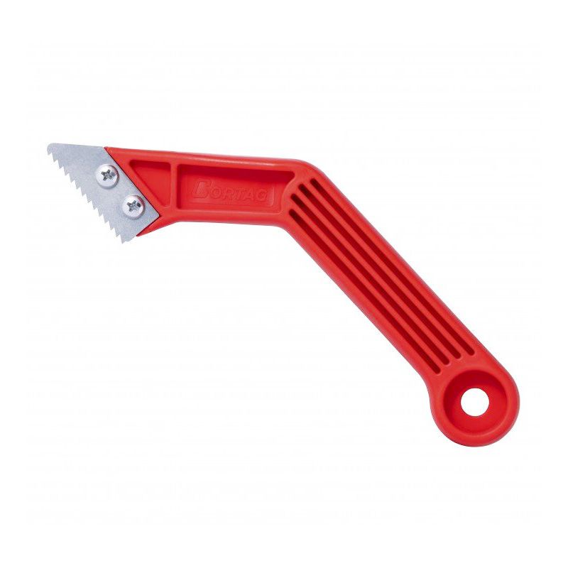 O raspador de argamassa foi desenvolvido para facilitar a remoção dos excessos de argamassa nas juntas entre os revestimentos, principalmente onde foi utilizado o espaçador nivelador, pois nesses pontos é onde há um maior acúmulo de argamassa.